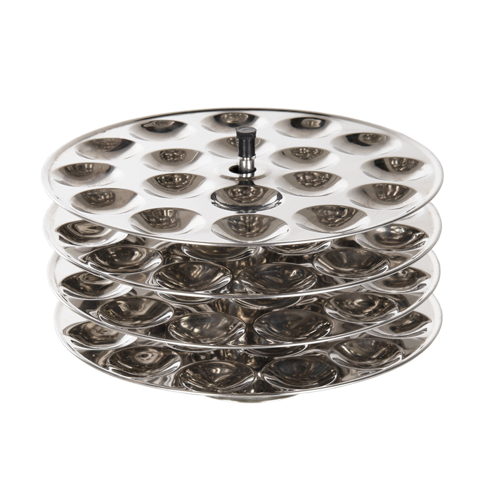 - This idli stand has four round tiers, each plate makes total 72 Idlies.