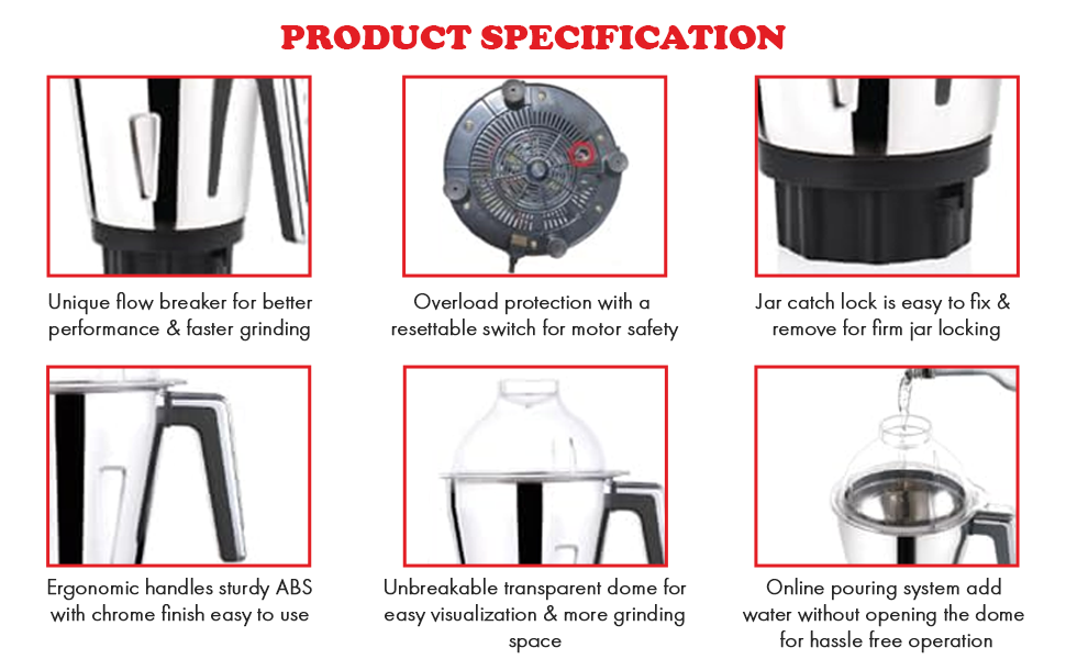 - Grinding Jar: 0.5 L ,1 L & 1.5 L Stainless Steel with Super power juice extractor and mini spice jar
